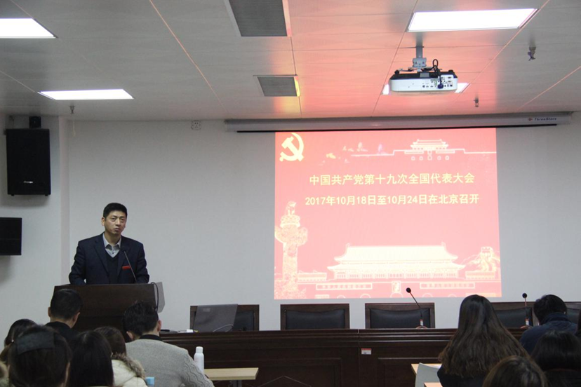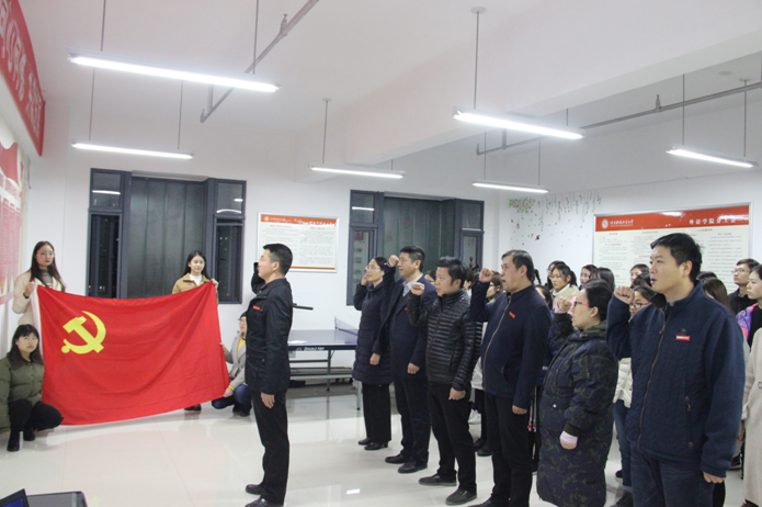 活动分为两个环节。首先,教工第五党支部全体党员在活动室观看视频并重温入党誓词,铭记党的使命,不忘初心。随后,学院党委书记岳彩军进行党员专题培训,他分别从入党誓词的演变发展、十九大会议精神以及党章的重大修改进行讲解,使教工党员进一步加深对党的理论知识的学习。