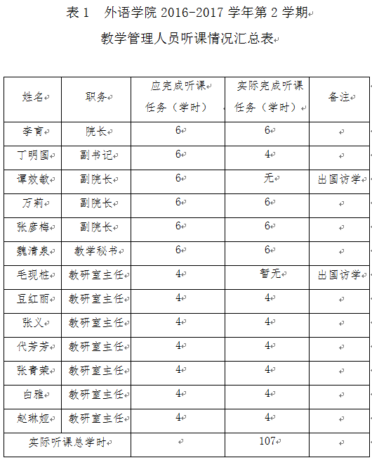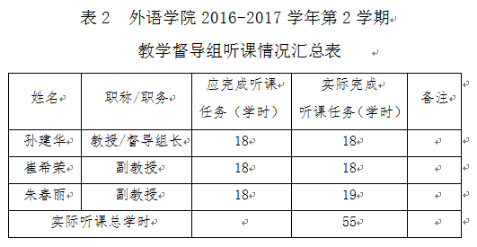 2016-2017学年第2学期,外语学院教学督导和教学管理人员按照《河南财经政法大学教学督导工作条例》、《河南财经政法大学教学管理人员听课管理规定》和《外语学院听课制度》的要求,认真完成听课任务。具体听课情况总结如下: