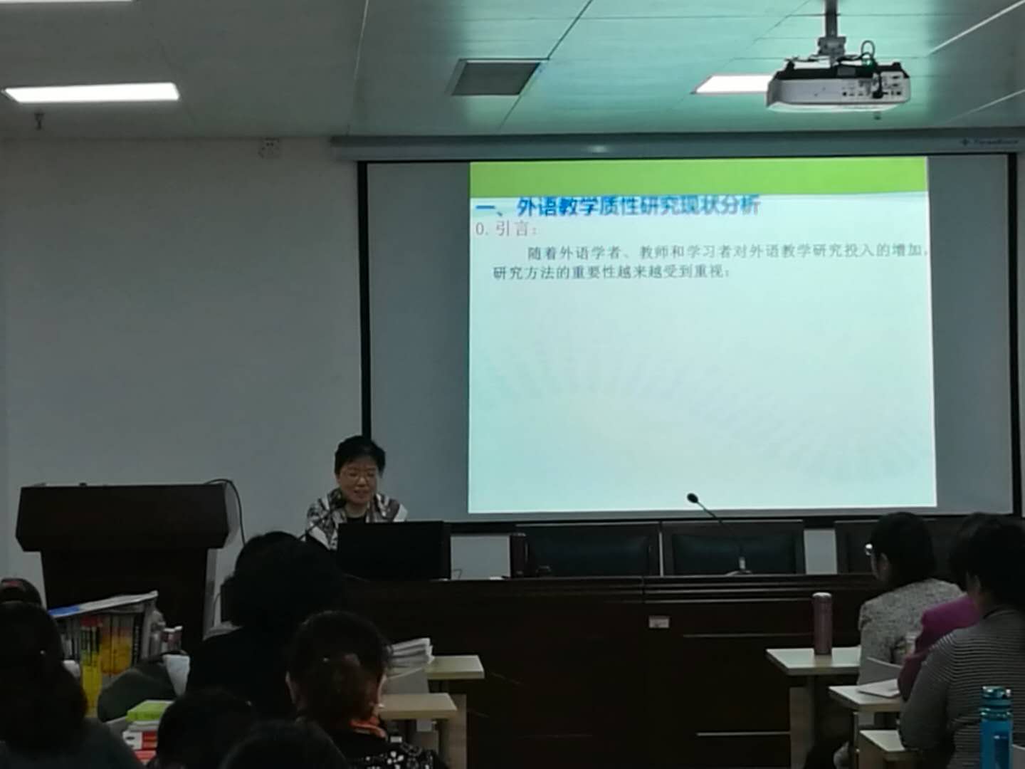 徐锦芬教授首先结合外语学院女性教师多的特点,从个人家庭主妇身份讲起,分享了她如何处理好家庭、教学和科研之间关系的成功经历,为此次报告做了一个很好的开场白。在报告中,徐锦芬教授首先认真详细地梳理了近年来国内外关于质性研究的研究现状,通过对比国内外外语类核心期刊刊出有关质性研究文章的差异,指出质性研究将是国内研究的主要方向。接下来,徐锦芬教授详细谈了如何在外语教学中开展质性研究,研究的必要性与可行性,着重从数据收集方法、数据分析方法以及质性研究论文或报告的撰写等几个方面结合自己的研究经历和已发表的多篇相关高水平论文为例深入浅出地教大家进行质性研究。最后,徐锦芬教授强调大学英语教学及研究本身就是每一位英语教师的职业追求。老师们要有敏锐的研究视角、扎实的教学实践和理论研究基础。
