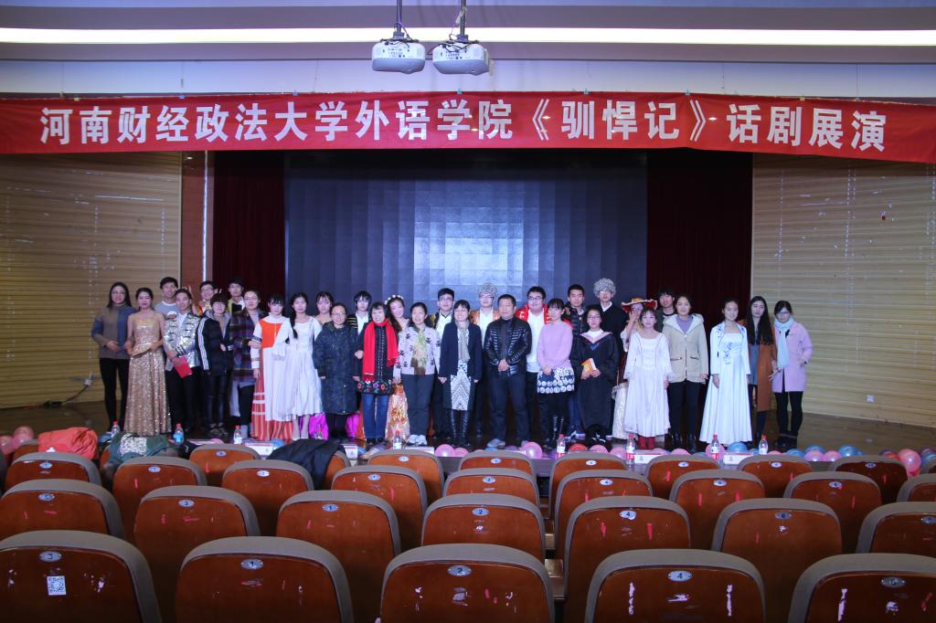 为纪念英国著名剧作家莎士比亚逝世四百周年,1月 5日晚七点,外语学院于一号教学楼 219报告厅举办大型英文话剧展演《驯悍记》,外语学院师生共计400余人到场观看。