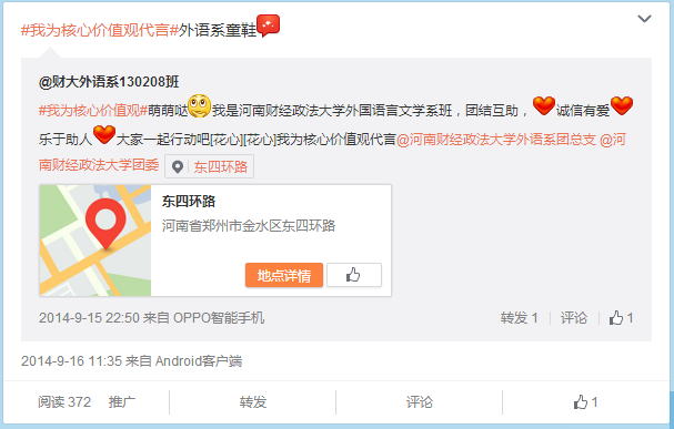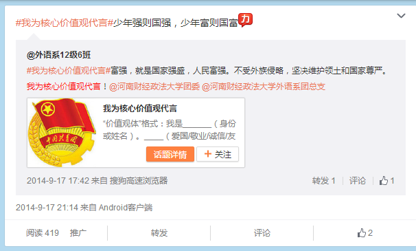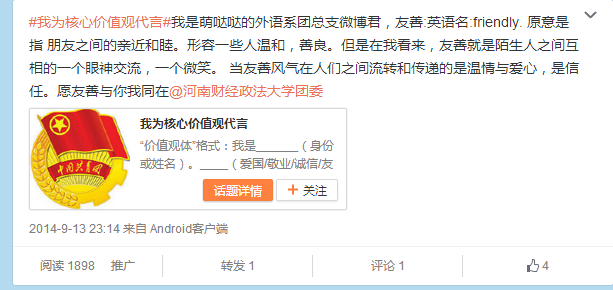 随着新媒体的兴起,其宣传方式越来越受到同学们的青睐,我系顺应此潮流,发起#我为核心价值观代言#的微博话题,效果良好,不仅我系同学积极参加话题互动,还有很多其他兄弟院系的同学参与互动,纷纷表达自己对核心价值观的理解和期望,在网上掀起一股学习核心价值观的热潮。