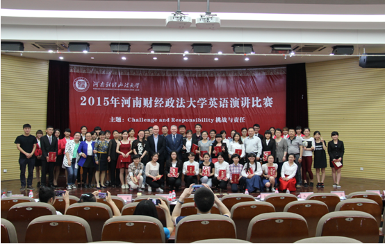 2015年4月27日、28日,由教务处、学工部、校团委主办,外国语言文学系承办的河南财经政法大学英语演讲比赛决赛在教一219成功举办,相关部门主要领导和院系党政领导出席了决赛。