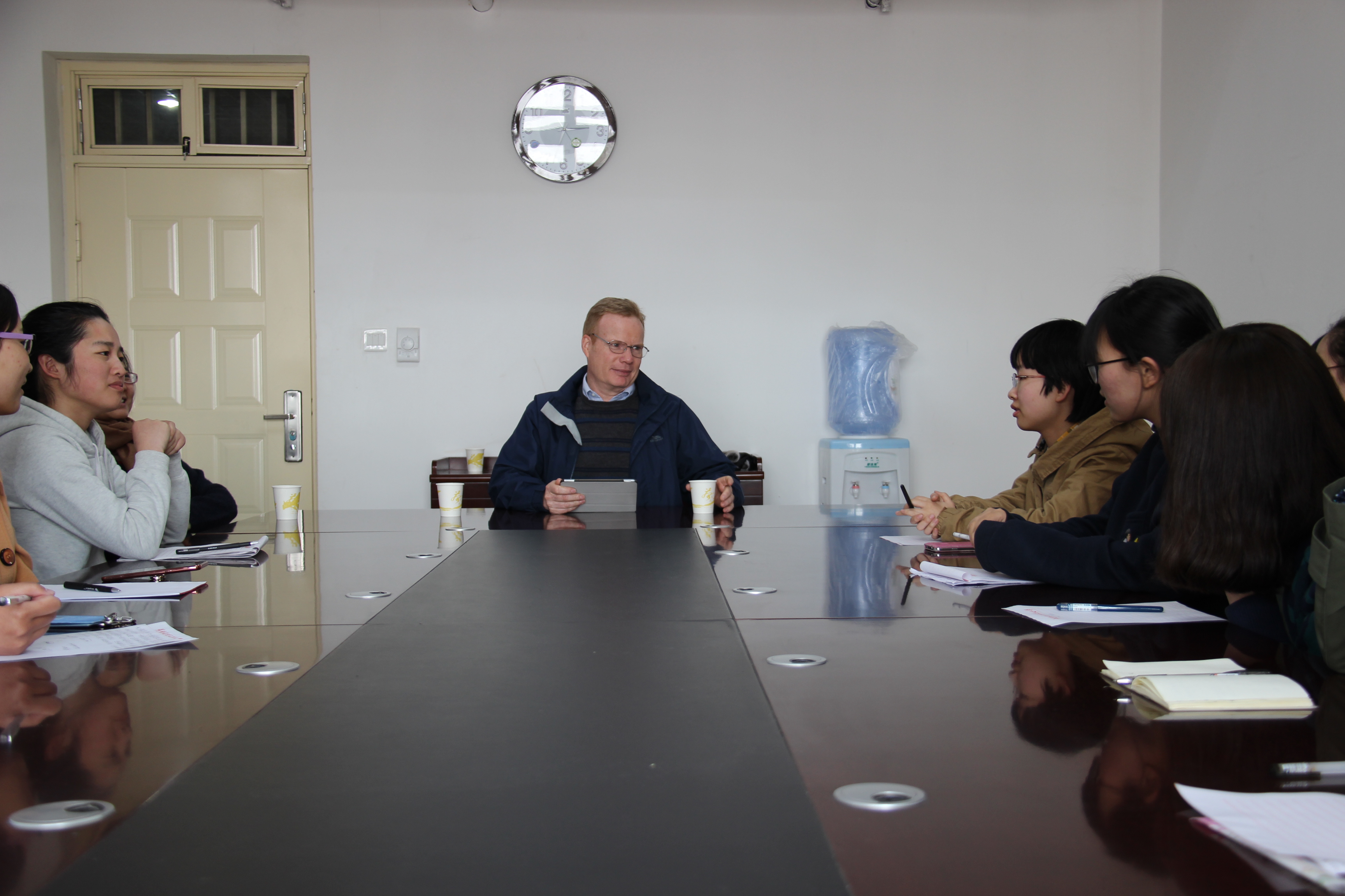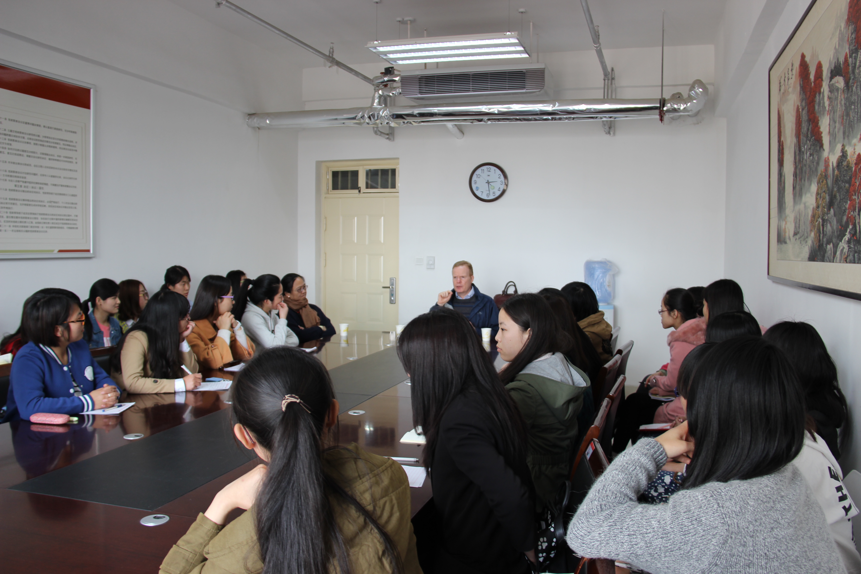 外语学院2016年度系列学术交流活动于3月28日拉开序幕。老师学生济济一堂,在教科739会议室举办英国文化学术座谈会。出席此次座谈会的有外语学院副院长万莉、教研室主任王自玲和13级部分学生,主讲人为英国曼彻斯特大学Mark Muller 教授。学术交流主题为:多元价值背景下的学术精神与英国文化