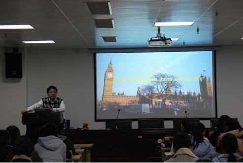 交流会以“UK Universities, here we come”为主题。傅通老师分别从英国的教育制度、英国高校的基本情况、为什么去英国、怎么能去英国这四个方面展开详细讲解。他通过播放幻灯片和举例的形式给同学们讲述了去英国留学的一些具体情况,使同学们加深了对英国教育制度和英国留学等方面情况的了解。最后,傅通老师与在座同学进行互动,对大家的问题进行耐心解答。