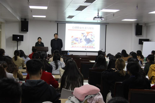 11月14日,张雪涛(中国翻译协会语言服务行业创业创新中心主任、国际译联ISO标准委员会委员)受邀莅临我院进行口译行业发展宣讲。宣讲会由外语学院副院长万莉主持,专业教研组老师张义、韩芳和大二大三学生参加了此次活动。