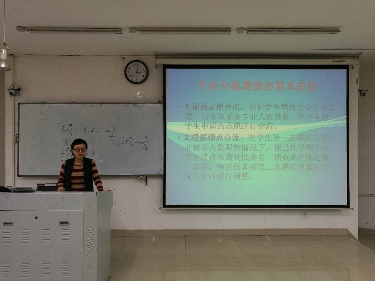 会上,李育院长就我校转专业、专业分流的有关政策结合外语学院招生的实际情况向学生进行了详尽的讲解。尤其对转专业的条件、报名资格以及具体的流程进行了重点解释。白雅老师针对专业分流工作,对商务英语专业、英语专业分别从课程设置、教学特点和专业分流遵循的原则等方面进行了阐述。